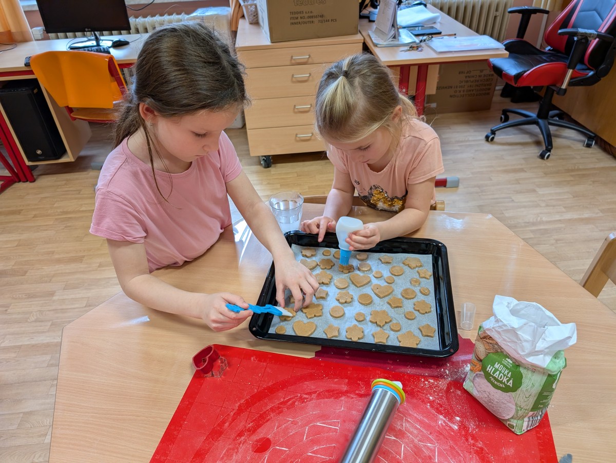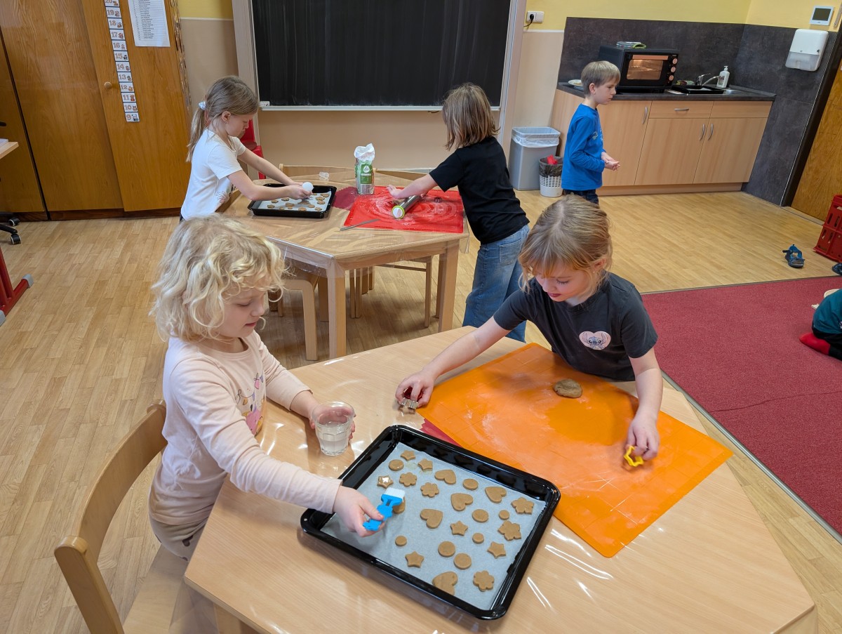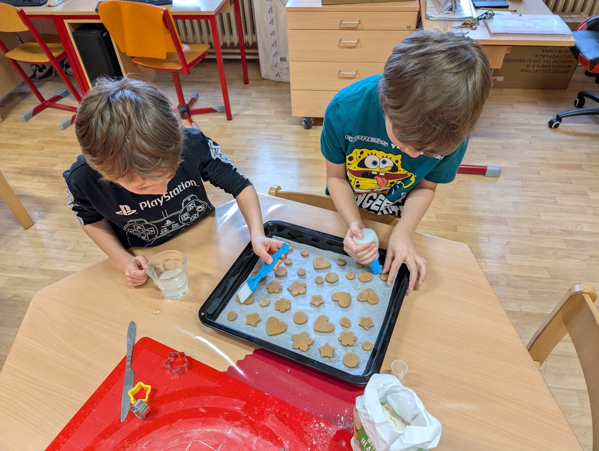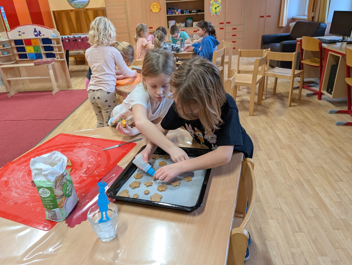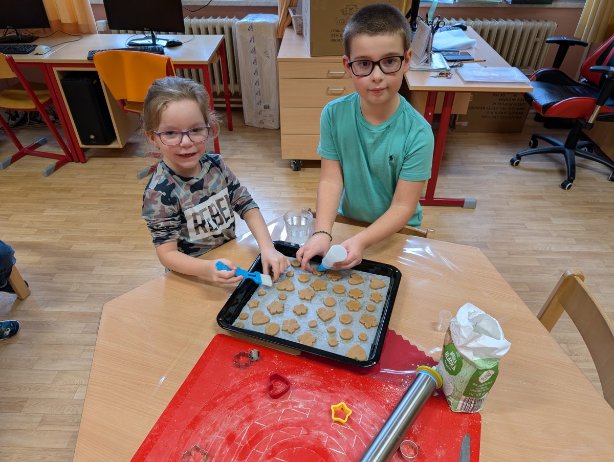 Ve školní družině se linula vůně perníčků a panovala radostná atmosféra. Děti z 1. třídy se s chutí pustily do pečení perníčků a zvládly téměř vše úplně samy. Od vykrajování až po přípravu plechů pracovaly s velkým nadšením, šikovností a pečlivostí. Děti pracovaly ve dvojicích, vzájemně si pomáhaly, domlouvaly se a krásně spolupracovaly. Bylo vidět, jak jsou samostatné a zručné, a že společná práce jim dělá radost. Jedinou pomoc poskytla paní vychovatelka při obsluze trouby, jinak děti zvládly celý proces samy. Velkou pochvalu si zaslouží také za to, že se nepřipálil ani jeden perníček. Výsledkem byly nejen voňavé a povedené dobroty, ale i krásný zážitek, na který budou děti dlouho vzpomínat.