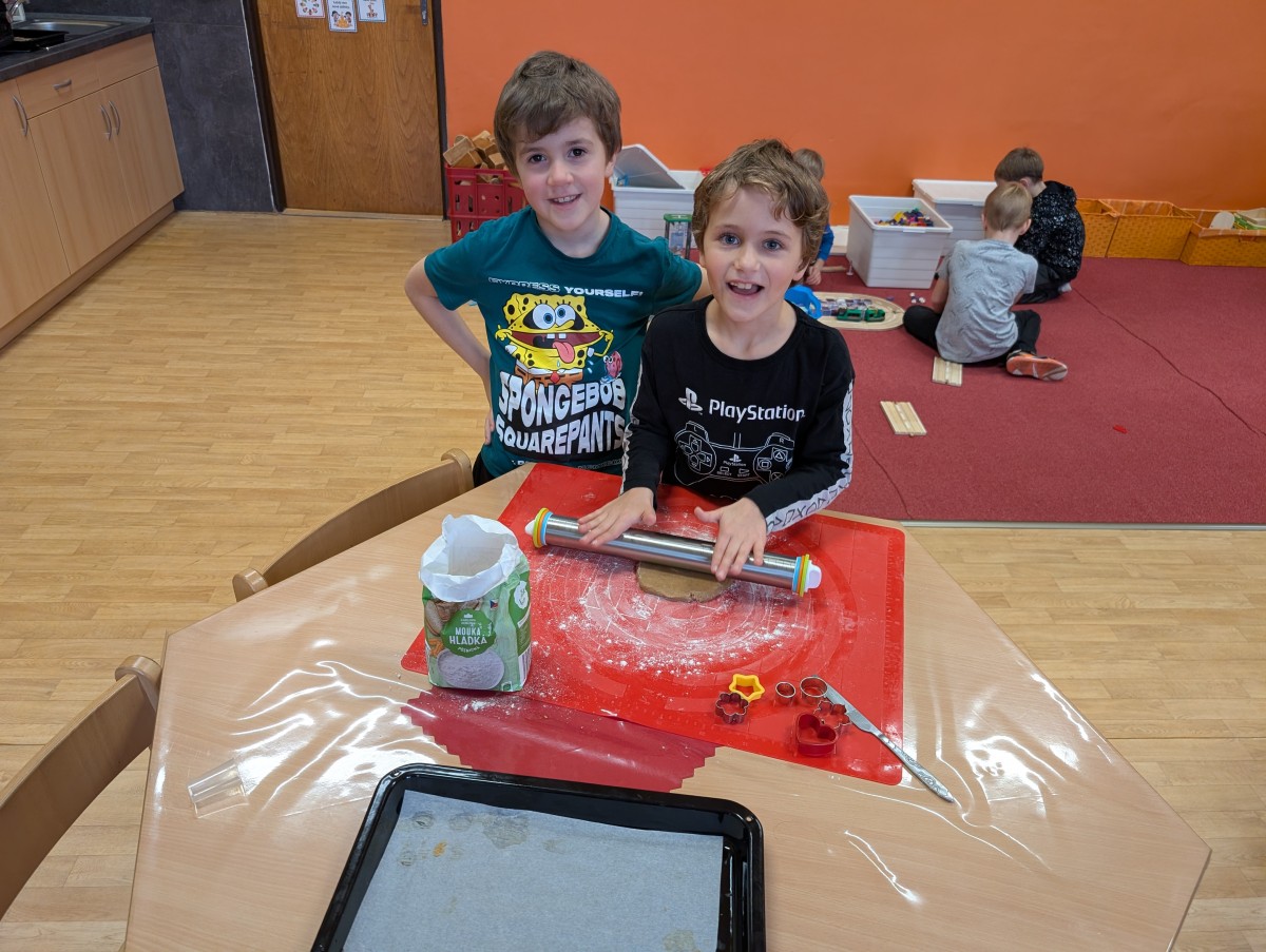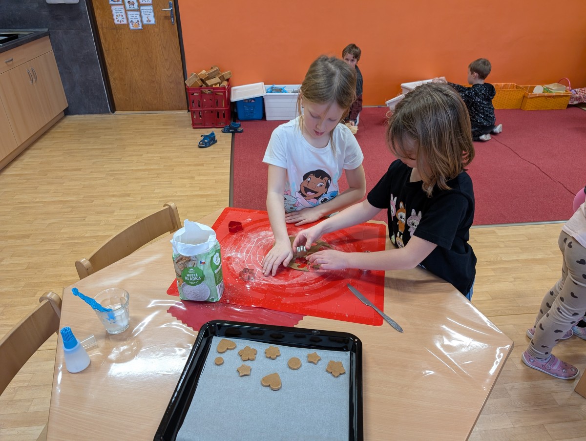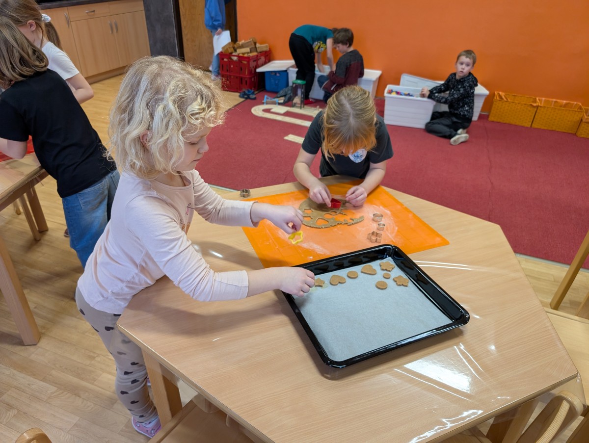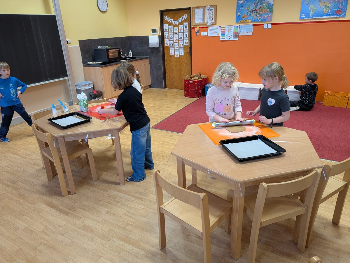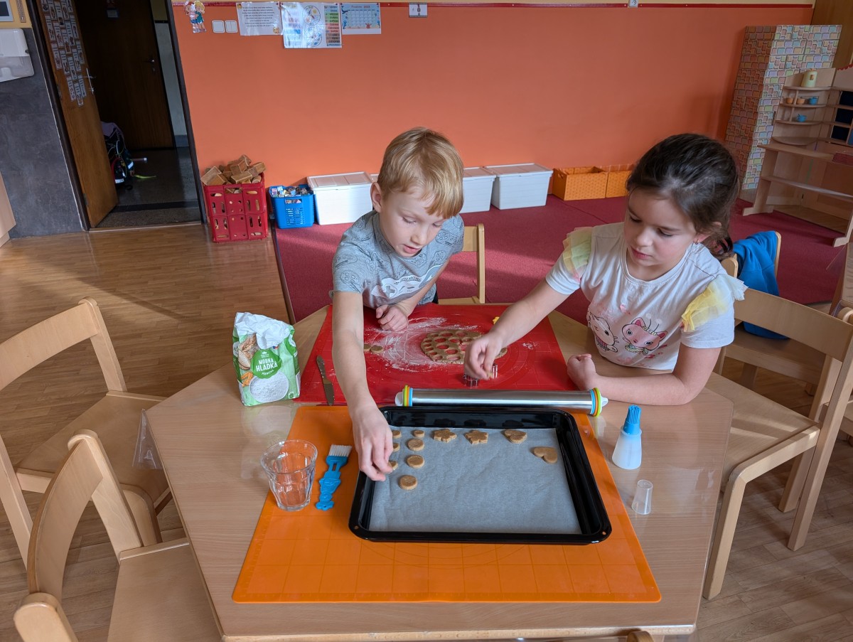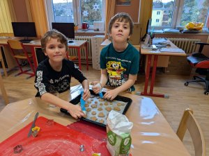 Ve školní družině se linula vůně perníčků a panovala radostná atmosféra. Děti z 1. třídy se s chutí pustily do pečení perníčků a zvládly téměř vše úplně samy. Od vykrajování až po přípravu plechů pracovaly s velkým nadšením, šikovností a pečlivostí. Děti pracovaly ve dvojicích, vzájemně si pomáhaly, domlouvaly se a krásně spolupracovaly. Bylo vidět, jak jsou samostatné a zručné, a že společná práce jim dělá radost. Jedinou pomoc poskytla paní vychovatelka při obsluze trouby, jinak děti zvládly celý proces samy. Velkou pochvalu si zaslouží také za to, že se nepřipálil ani jeden perníček. Výsledkem byly nejen voňavé a povedené dobroty, ale i krásný zážitek, na který budou děti dlouho vzpomínat.