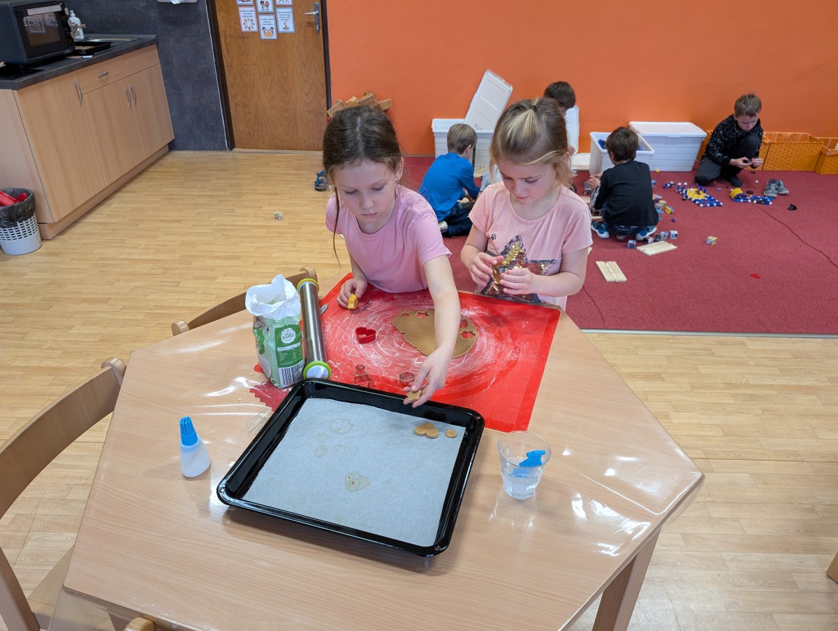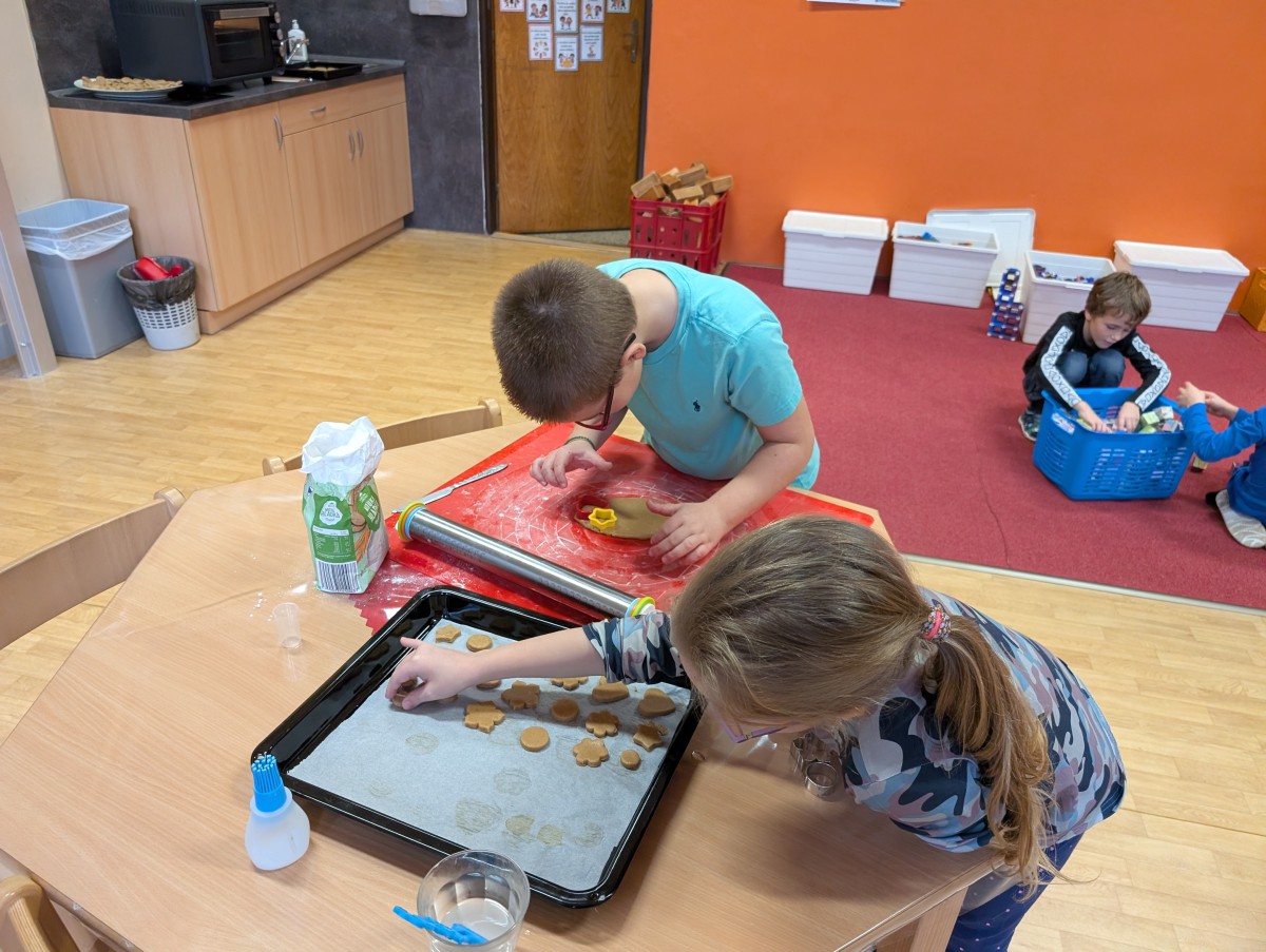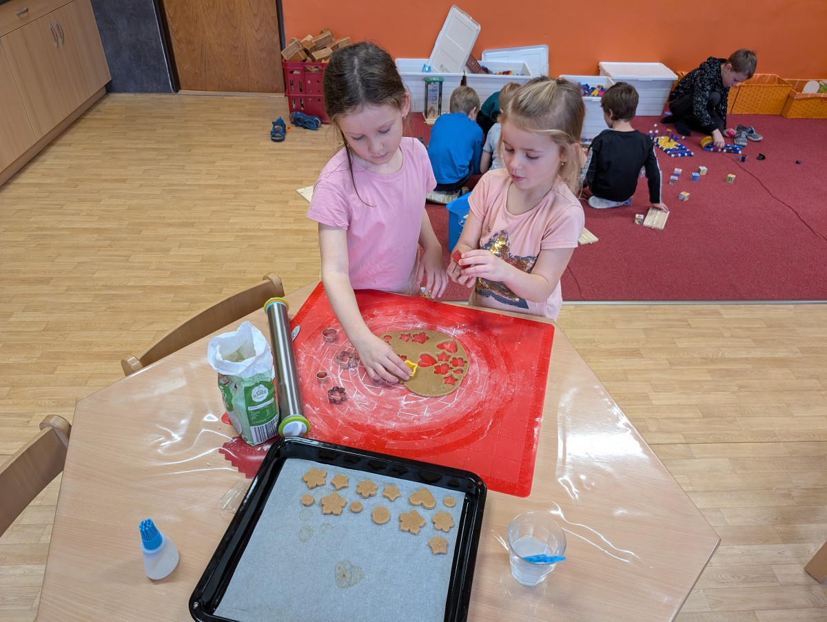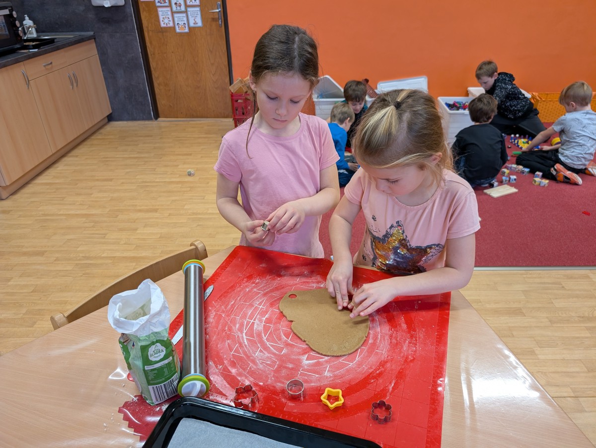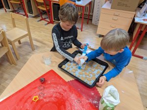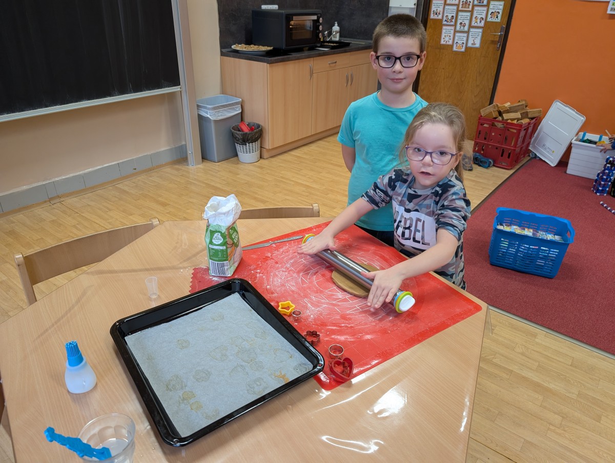 Ve školní družině se linula vůně perníčků a panovala radostná atmosféra. Děti z 1. třídy se s chutí pustily do pečení perníčků a zvládly téměř vše úplně samy. Od vykrajování až po přípravu plechů pracovaly s velkým nadšením, šikovností a pečlivostí. Děti pracovaly ve dvojicích, vzájemně si pomáhaly, domlouvaly se a krásně spolupracovaly. Bylo vidět, jak jsou samostatné a zručné, a že společná práce jim dělá radost. Jedinou pomoc poskytla paní vychovatelka při obsluze trouby, jinak děti zvládly celý proces samy. Velkou pochvalu si zaslouží také za to, že se nepřipálil ani jeden perníček. Výsledkem byly nejen voňavé a povedené dobroty, ale i krásný zážitek, na který budou děti dlouho vzpomínat.